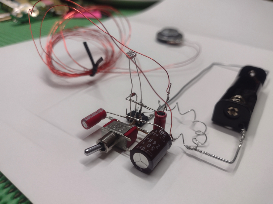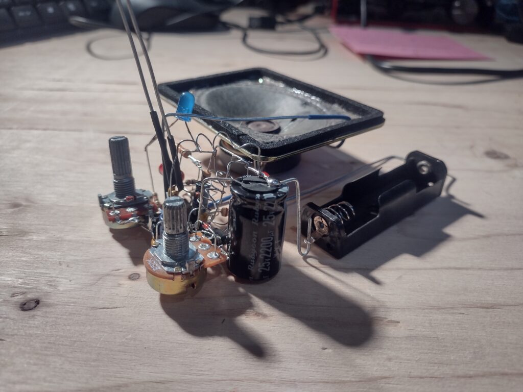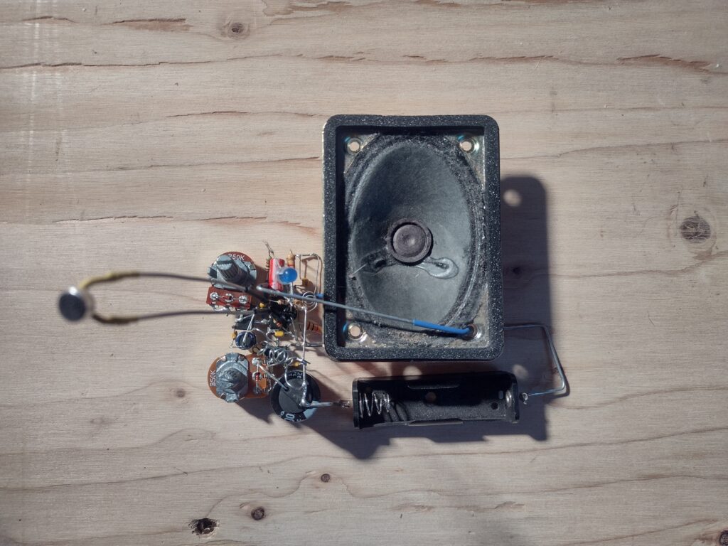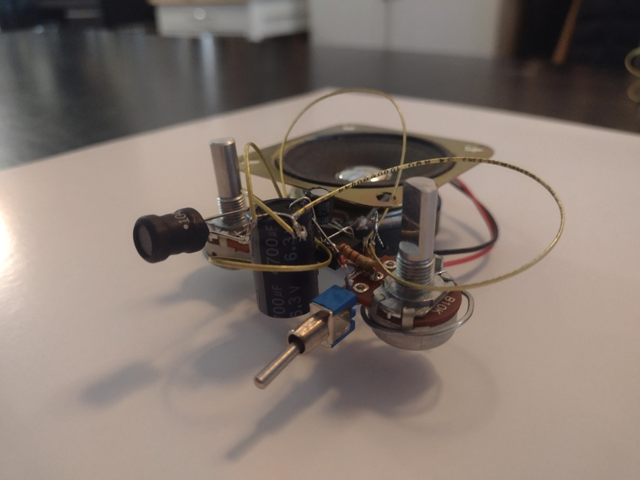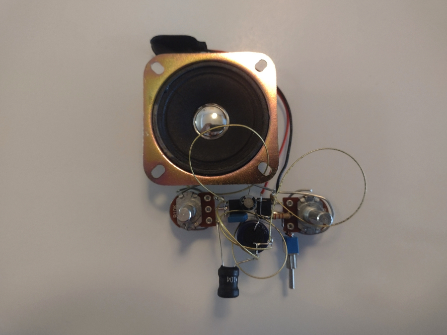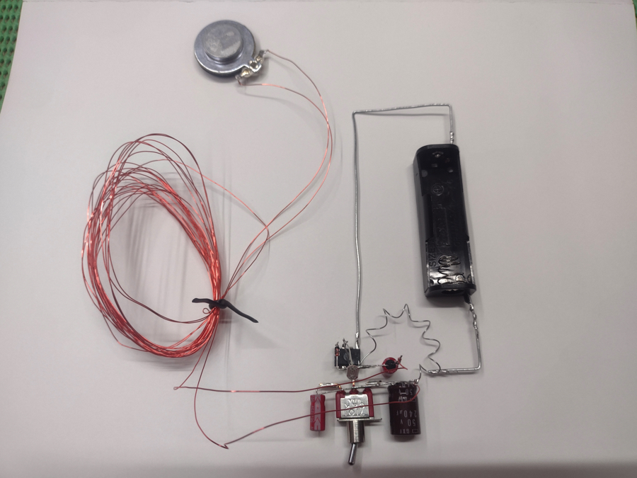 Une combinaison d’un circuit d’oscillateur astable fait avec un circuit intégré 555 (avec l’option d’une diode en parallèle avec le potentiomètre pour avoir un duty cycle de moins de 50%) et d’un circuit d’amplification fait avec un circuit intégré LM386 (Nicolas Collins’ hacker’s little amp). La bobine (coil) capte les champs électromagnétiques qui sont traduits en bruit par le haut-parleur. Le circuit 555 ouvre et éteint périodiquement l’amplificateur. Un potentiomètre contrôle la vitesse de la période d’ouverture/fermeture de l’ampli, l’autre contrôle le volume de l’ampli.