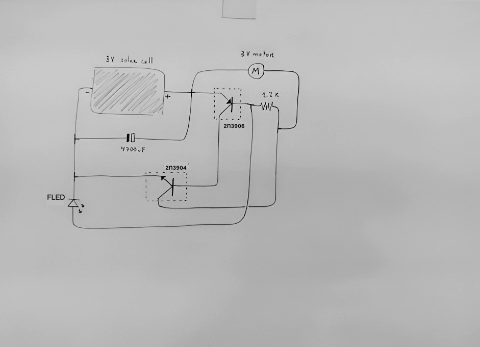Circuit de style BEAMbot fait à partir de deux transistors (2N3904 et 2N3906) et d’une cellule photovoltaïque pour activer un moteur. Il est important d’utiliser une FLED (flashing LED) et non une LED régulière.