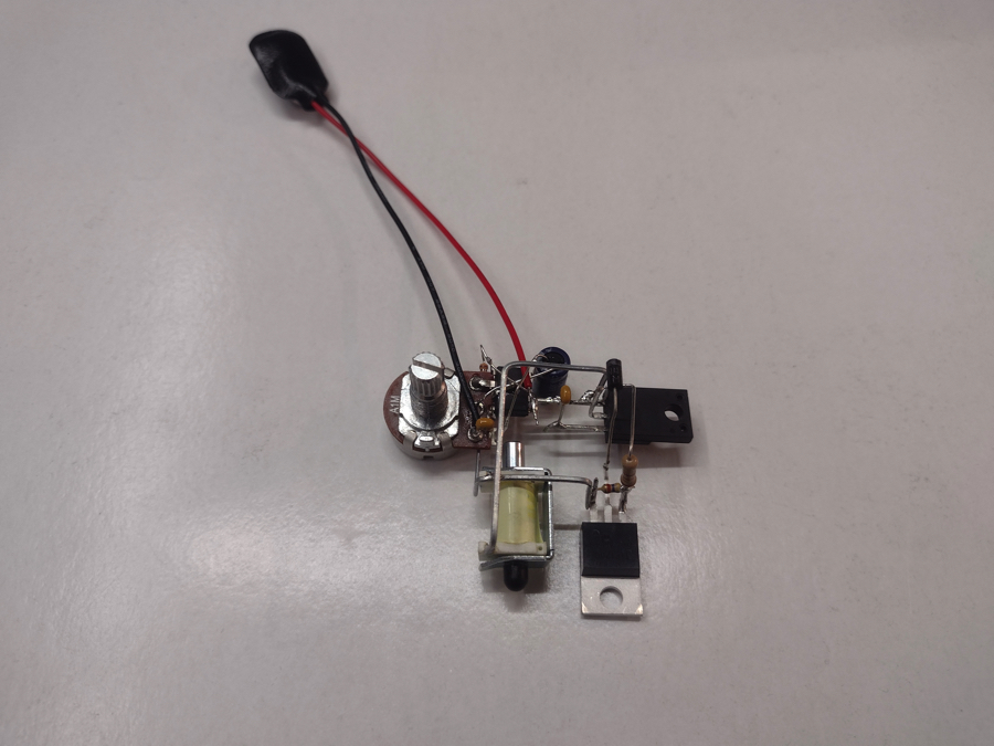 Combinaison d’un circuit d’oscillateur astable fait avec un circuit intégré 555 (incluant une diode en parallèle avec le potentiomètre pour avoir un duty cycle de moins de 50%) et d’un circuit driver de solénoïde fait avec un MOSFET et un transistor TIP120. Le potentiomètre permet de contrôler la vitesse d’itération du solénoïde.